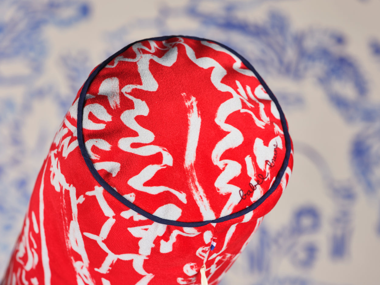 Le coté suranné de l'objet traversin, associé à un motif résolument vibrant et contemporain, en fait une pièce de décoration pointue et joliment décalée.